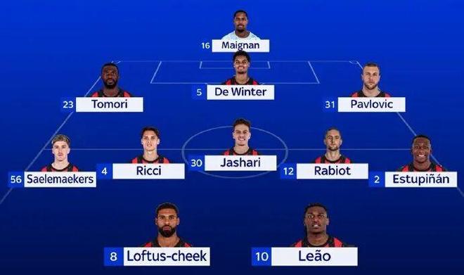 米兰3511:迈尼昂;托莫里、德温特、帕夫洛维奇;萨勒马科尔斯、里奇、亚沙里,拉比奥特、埃斯图皮尼安;奇克、莱奥